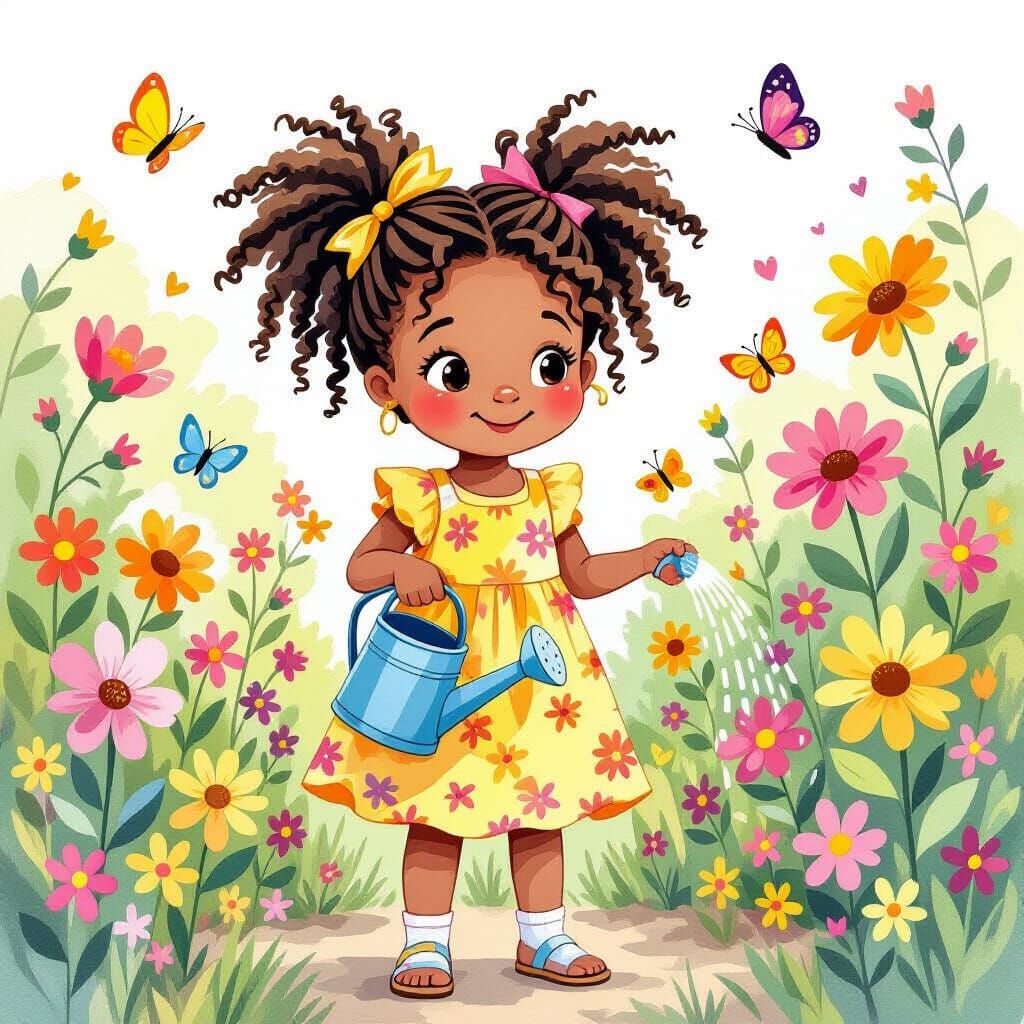 This image shows a young girl with braided hair in a colorful garden. She wears a sundress and waters the plants. The artwork uses wet-on-wet watercolor techniques and airbrushed textures.