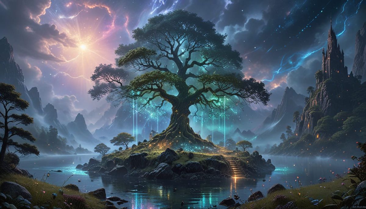 This image shows a colossal crystalline tree growing from a floating island, roots dripping light into an abyss. Ruins of an ancient civilization surround the tree in a cosmic, ethereal style.