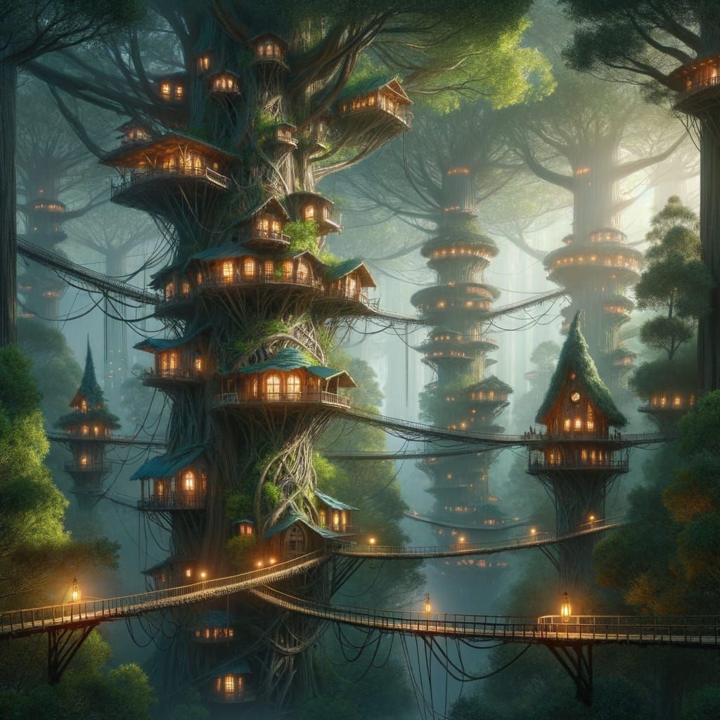 A whimsical network of treehouses connects within a misty, ancient forest, featuring unique architecture and lantern-lit bridges