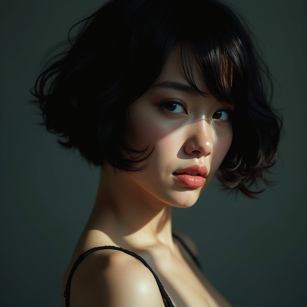 This image showcases a hyper-realistic portrait of a woman with short hair, featuring intense details and photogenic lighting that accentuates her facial features and curves, with a blend of sharp shadows and soft diffused light, capturing the subtleties of human skin and hair texture.