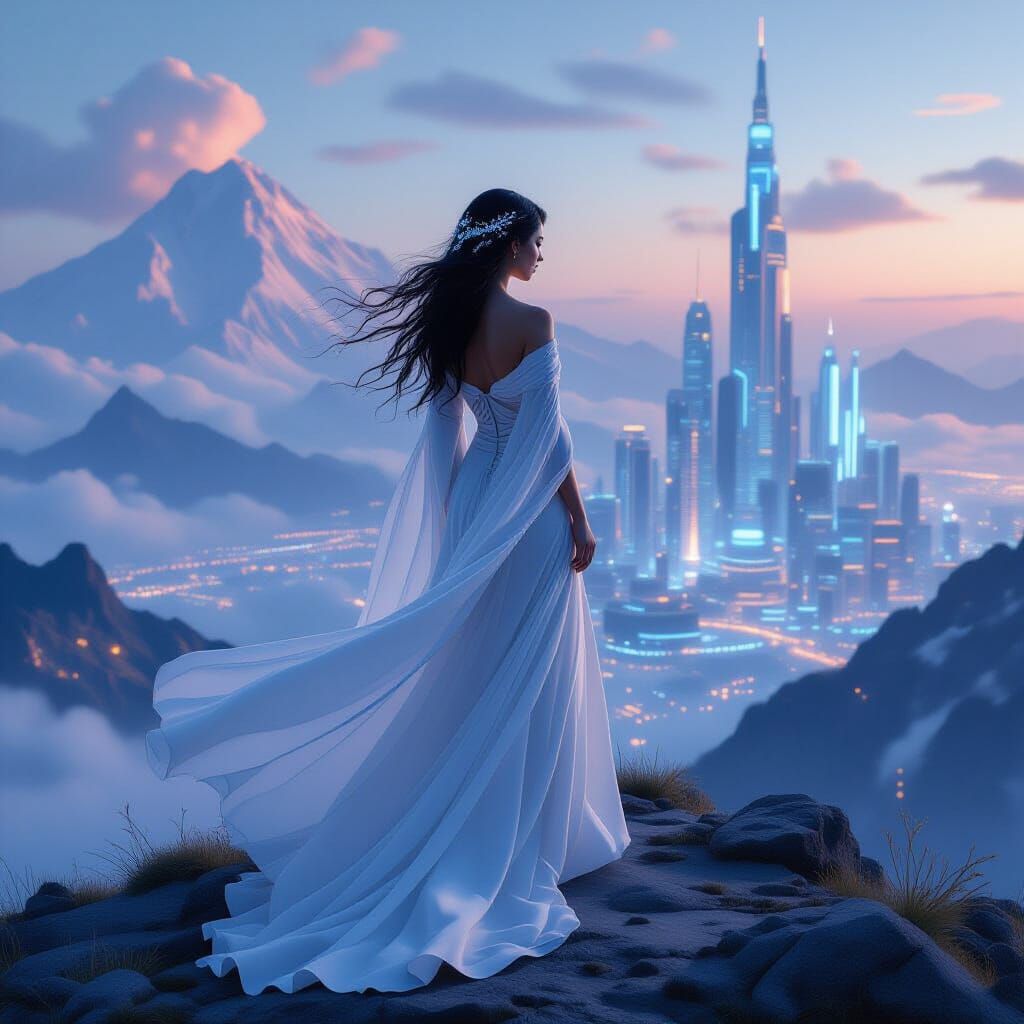 This image shows a woman with hair styled as flowing kintsugi standing on a mountain. Below her is a futuristic city with bioluminescent flora and architecture, rendered with surreal and intricate details.