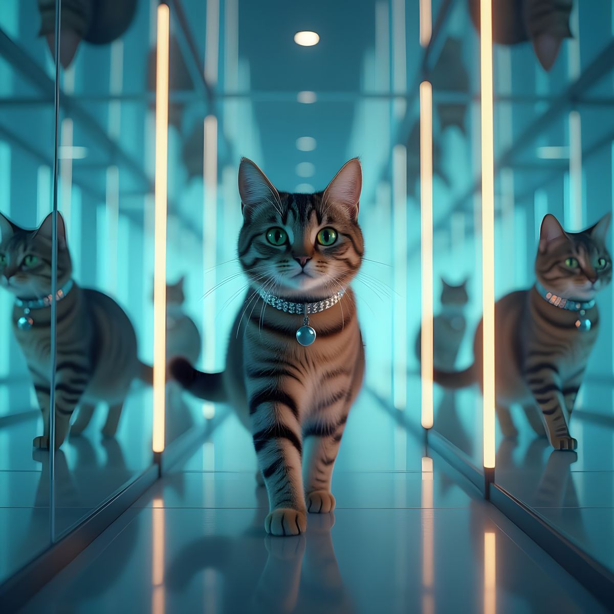 This hyperrealistic image shows a proud and friendly cat exploring a world of reflections within a complex glass mirror maze.