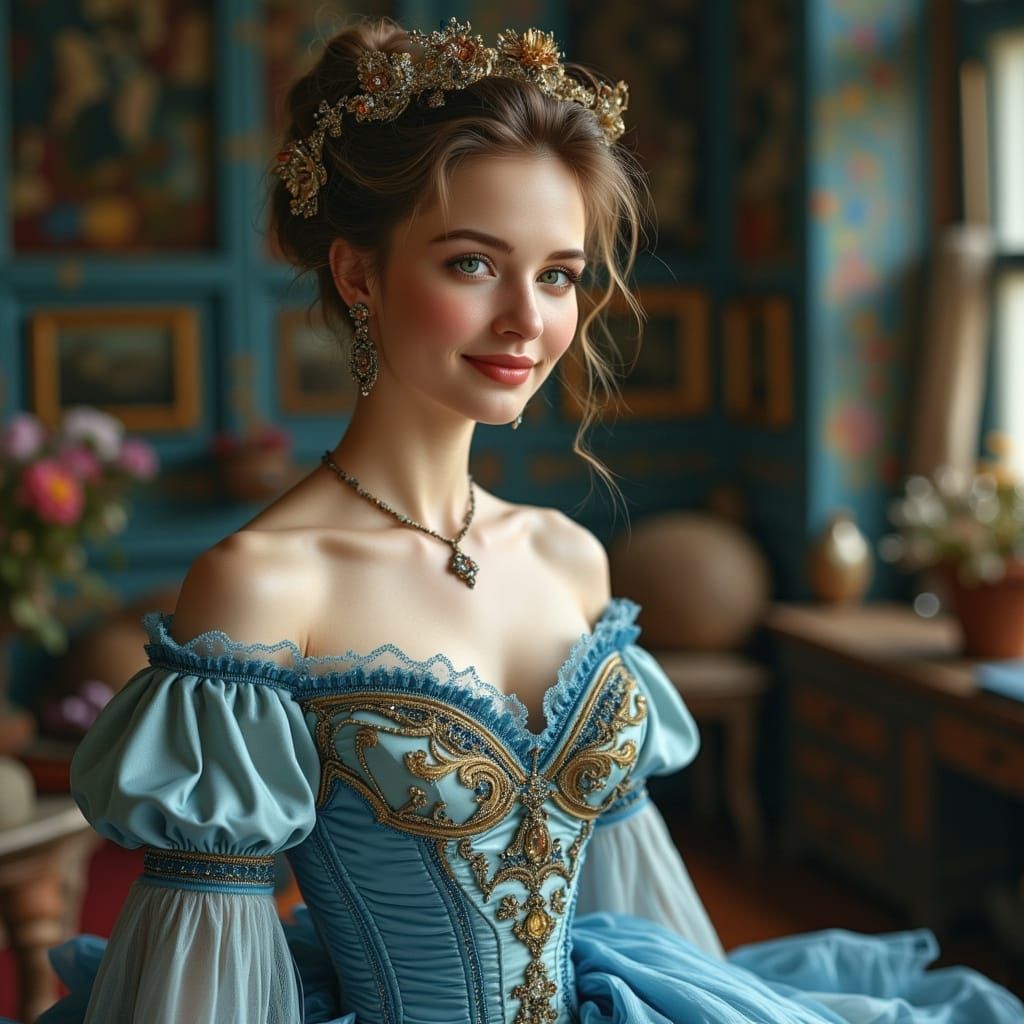 This image shows an elegant European woman smiling and wearing a light blue striped corset dress. The portrait features hyperrealistic details with soft lighting, reminiscent of classical art.