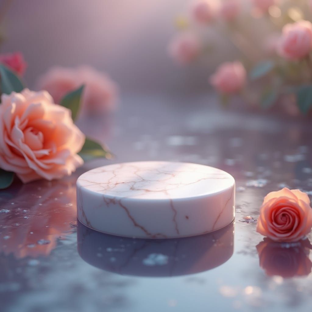 This image features a delicate marble pedestal reflected in calm, glassy river water, surrounded by soft peach and red roses in a serene, pastoral atmosphere, bathed in gentle purple and blue hues.