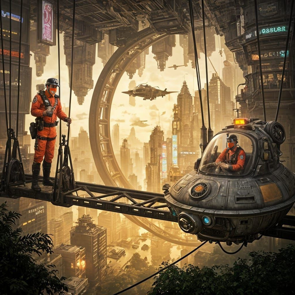 A medium-range action scene showing two members of the upside-down city’s police force pulling over a hover-bike rider in a dense, verdant sci-fi district. The patrol vehicle is a disc-shaped craft with a gritty, biomechanical H.R. Giger aesthetic—dark, ribbed surfaces, glowing seams, and exposed tubing. ...