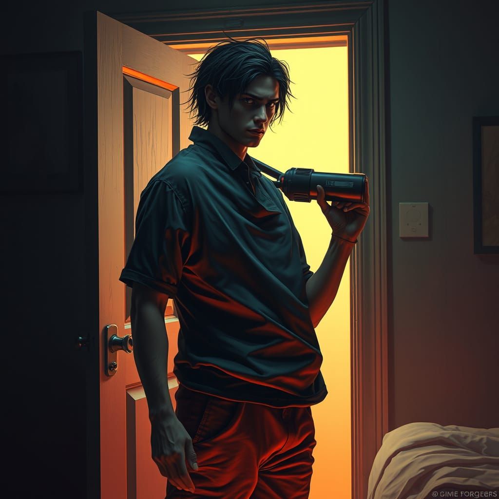 A dramatic portrait of a figure concealing an object behind their back, standing in a doorway. The image features dynamic lighting and intricate details, with ornate lines and organic shapes.