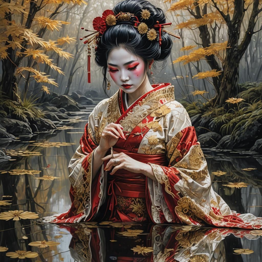 Ornate Japanese Geisha in red and white and black and golden dress made of lace touching a mirrored reflection of herself, lace art, golden intricate motifs lacecraft dandelion pond, glowing forest background, dark hair, dark fantasy, intricate details, hyper detailed, Jean Baptiste Monge, Carne Griffiths, ...