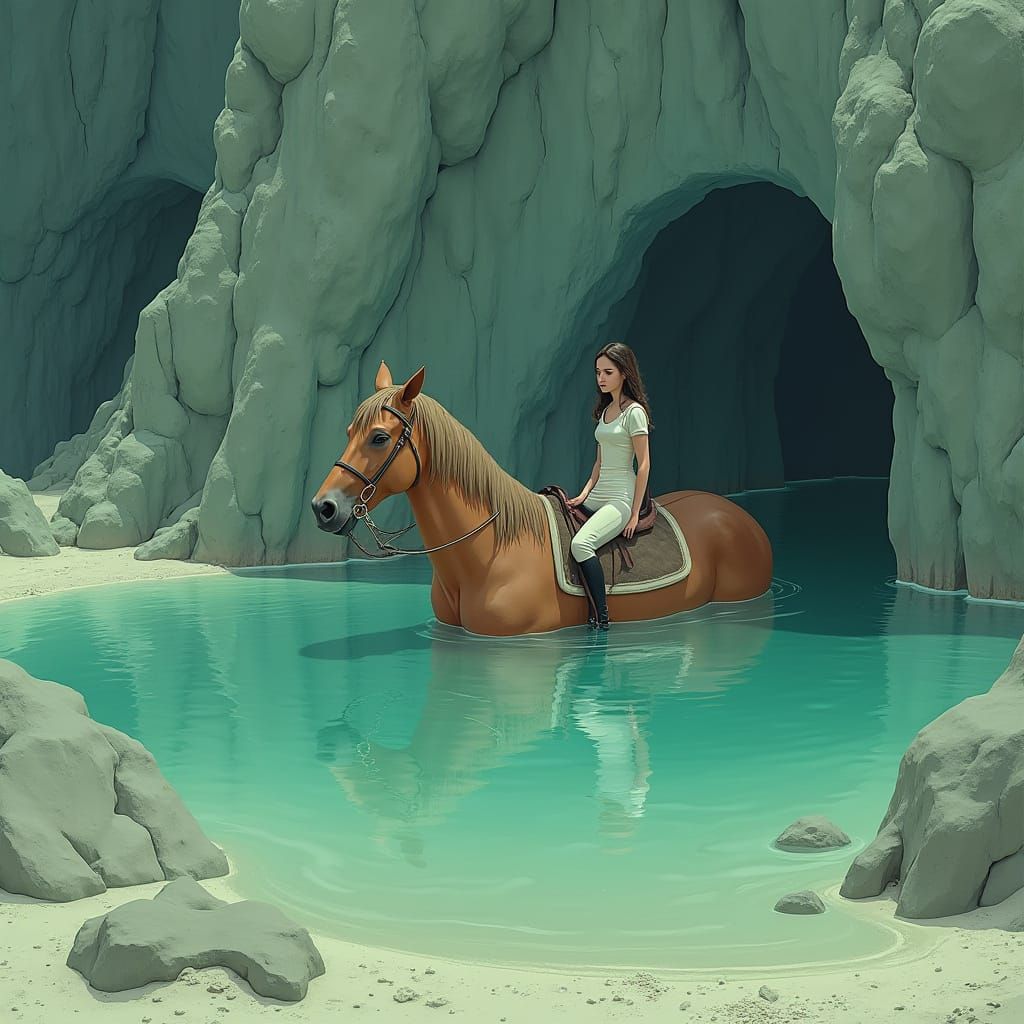 Dentro de uma moldura dourada, uma torneira velha e enferrujada começa a jorrar água cristalina, que desce suavemente até um cavalo de pelagem de castanha, que se abaixa para beber. A cena parece um sonho, onde a água flui como um rio dentro de um espaço limitado. Uma mulher de vestes simples está montada ...