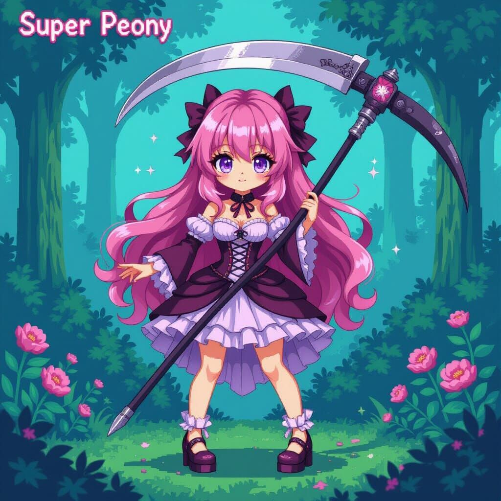 This image shows a cute gothic girl with pink hair wielding a scythe in a retro pixel art style. The character is wearing a detailed gothic lolita dress in a fantasy 8-bit game world.