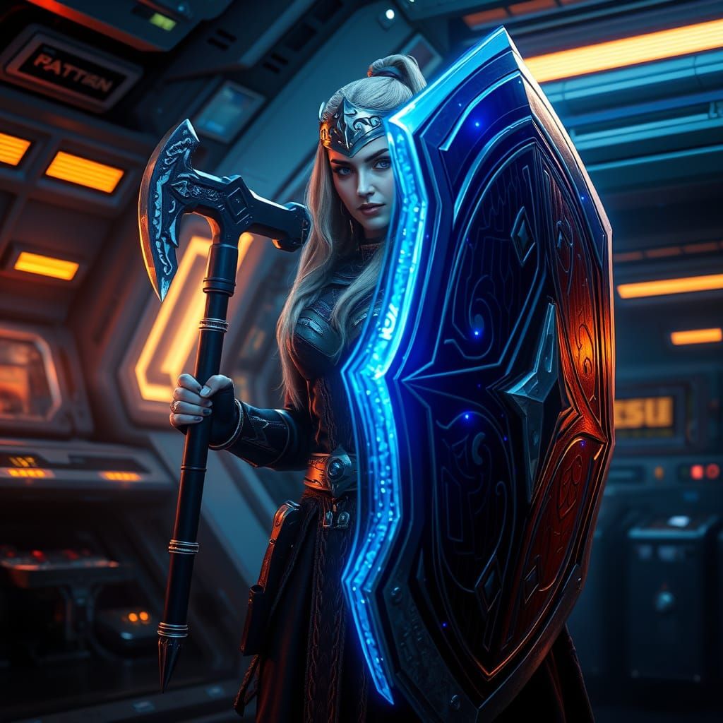 beautiful norse shield maiden standing aggressively holding a holographic battle axe board the spaceship