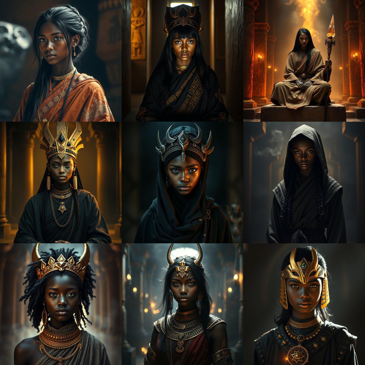 A hyperrealistic portrait of a dark-skinned young female monk inspired by the Egyptian god Anubis. The image features intricate details, high contrast, and a cinematic, moody atmosphere.