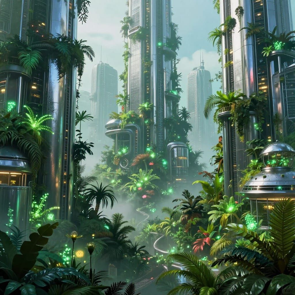 This image showcases a futuristic city where chrome skyscrapers are intertwined with glowing jungle plants. The scene features dense fog, dappled light, and a rich, verdant color palette in a detailed digital matte painting style.
