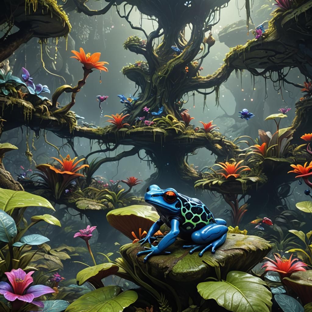 A vibrant matte painting of a fairy riding a poison dart frog. This fantastical image features intricate details, deep colors, and complementary hues, rendered as fantasy concept art.