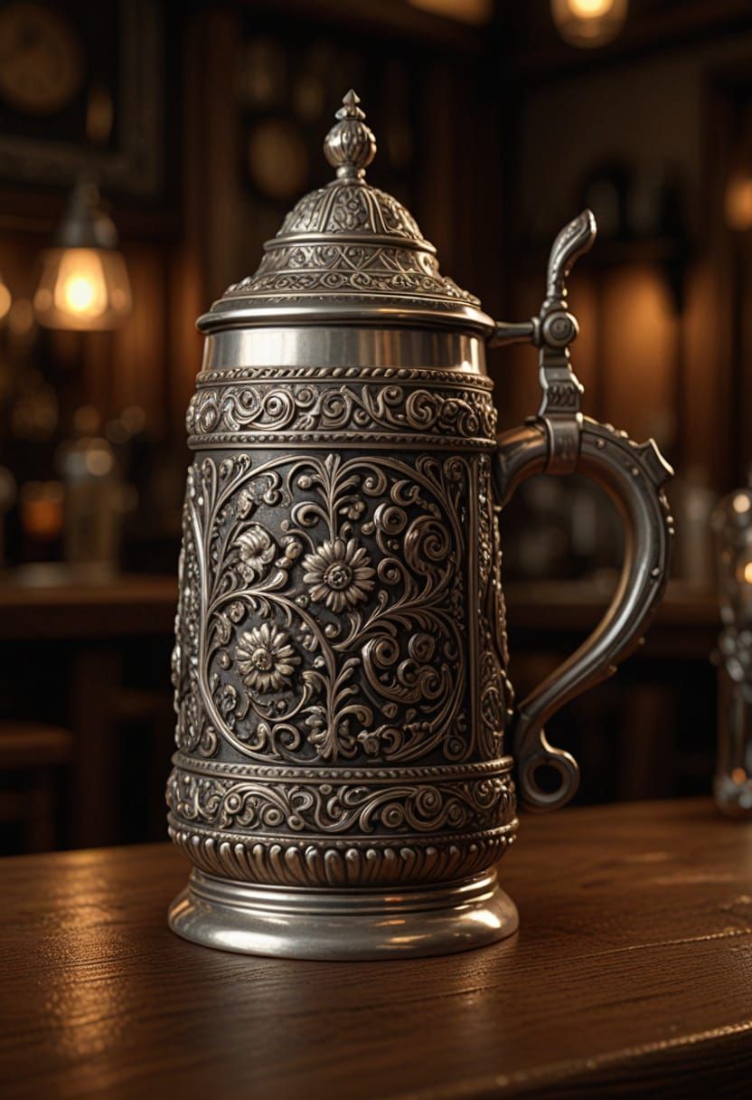 A hyper-realistic 8K close-up of a German Stein mug on a wooden surface. The mug features intricate ceramic patterns, a reflective silver lid, and is illuminated by warm ambient lighting.