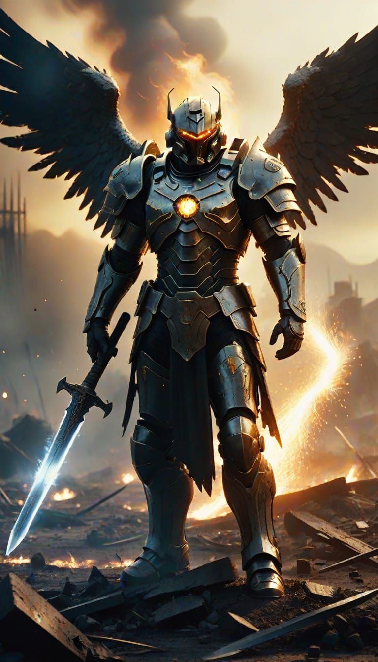 This image shows an armored angel holding a glowing sword on a desolate battlefield, with a demonic entity in the background. Rendered with hyperrealistic detail and dramatic lighting.