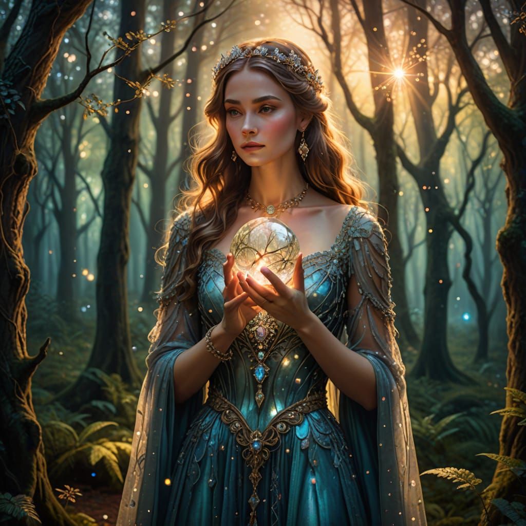 This enchanting illustration features a mystical woman holding a glowing crystal orb in a lush forest, surrounded by sparkling stars and a dreamy atmosphere with intricate details and vibrant colors.