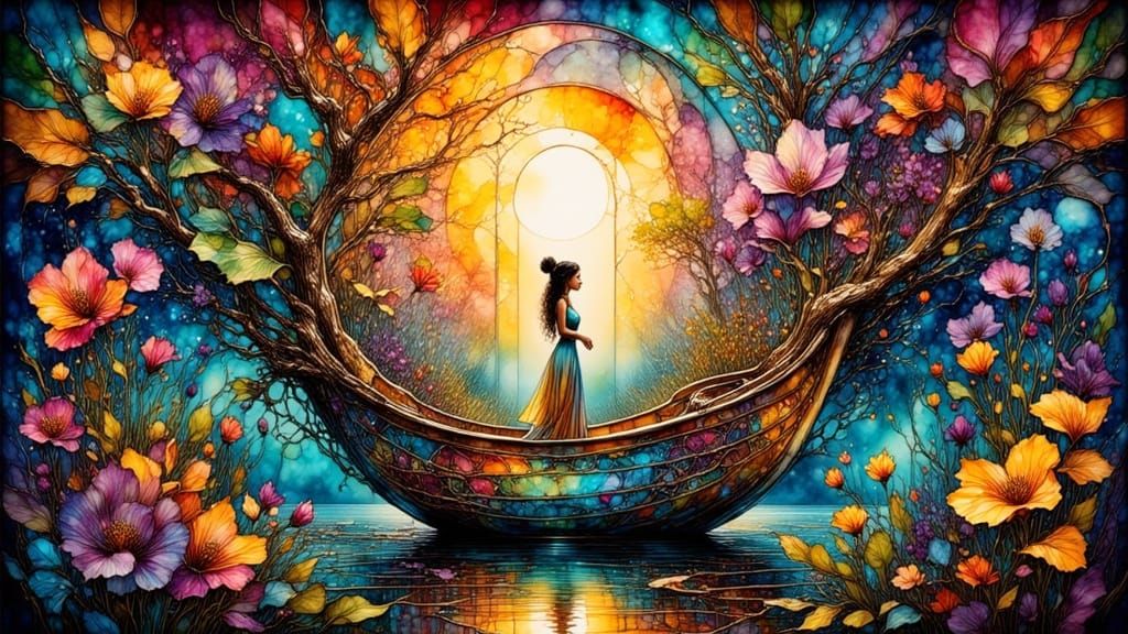 This image showcases brilliant African art with a focus on femininity and an encaustic spiral reflection, evoking otherworldly synesthesia and dimensional samsara.