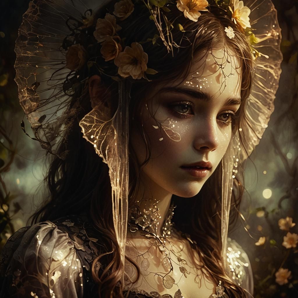 A captivating image of a girl in a moonlit garden. The artwork evokes dark romanticism with impressionistic brushstrokes and soft focus, accentuated by iridescent silver highlights and monochromatic tones.