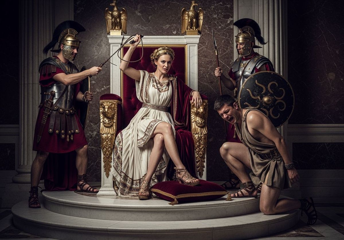 This image shows Empress Messalina on her throne, attended by legionnaires and a prisoner. The scene evokes a cinematic, high-contrast aesthetic reminiscent of professional studio photography.