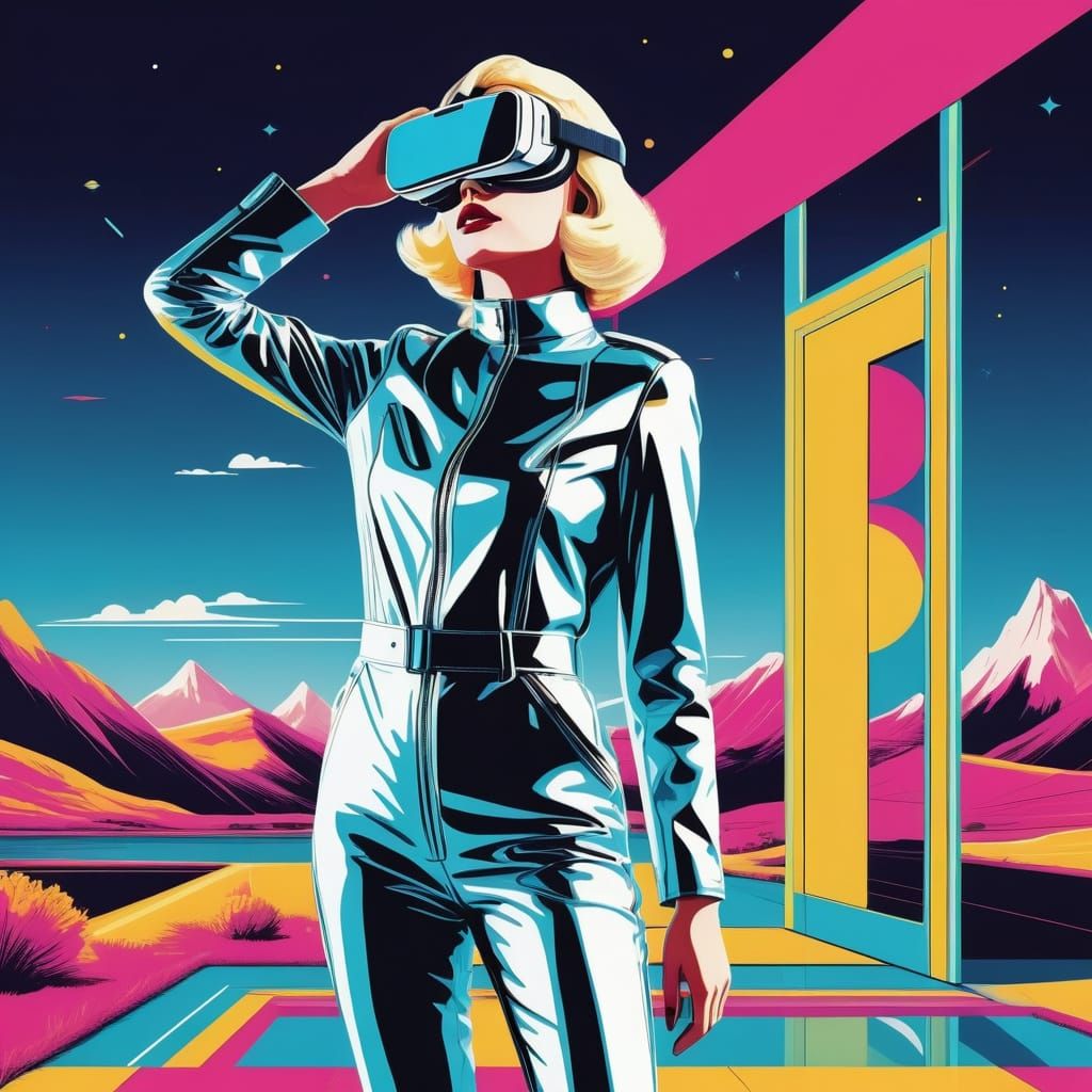 This image shows a retro-futuristic advertisement for VR travel. A woman in a silver jumpsuit stands by a portal against a pixelated landscape, rendered in a bold pop art style.