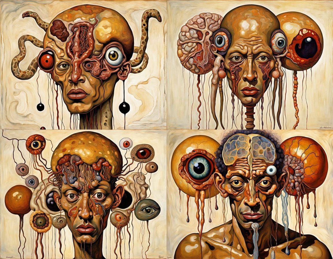 A surreal image of a jellyfish giraffe hybrid with visible internal organs and brown liquid. The artwork evokes terror through surrealist elements and grotesque anatomy.