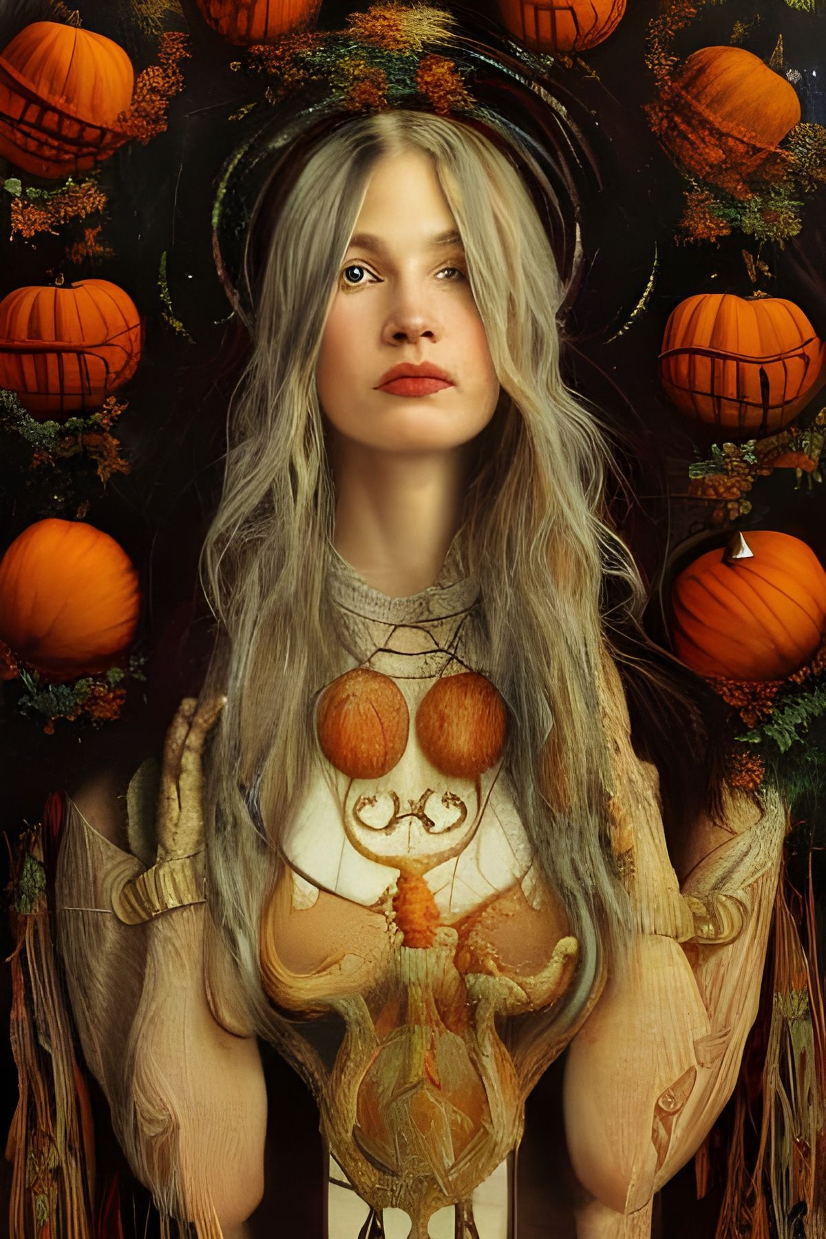 A hyperrealistic painting of a priestess embodying autumn and harvest. The intricate artwork features elegant and ornate details, enhanced by volumetric lighting.