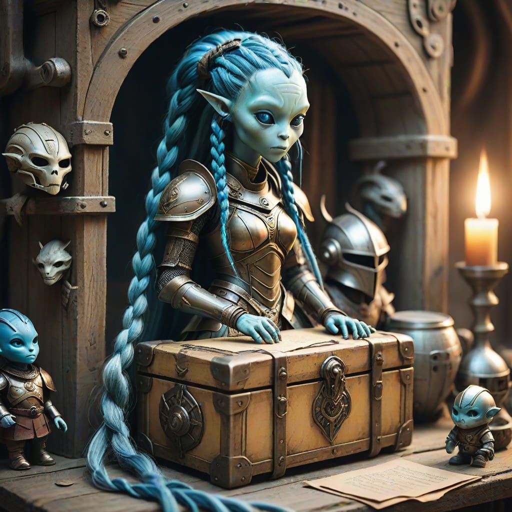 This image shows a nostalgic collection of retro-style figurines in a weathered wooden box, evoking a mystical atmosphere with hints of golden light and soft focus.