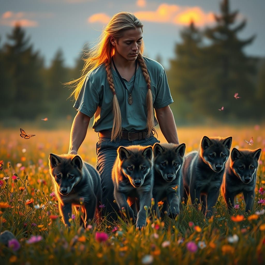 This image captures a heartwarming moment of a young man surrounded by playful wolf pups amidst a field of colorful wildflowers, bathed in the warm glow of the setting sun, in a highly detailed and dramatic hyperrealistic art style.