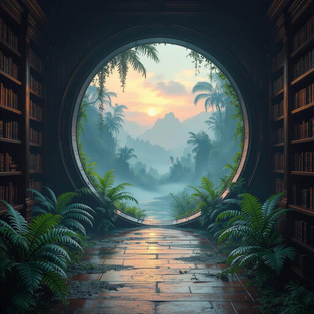 This image shows a glowing portal suspended in a wood-paneled library. The gateway reveals a Carboniferous swamp with giant ferns beneath an orange sky, all rendered as a detailed matte painting.