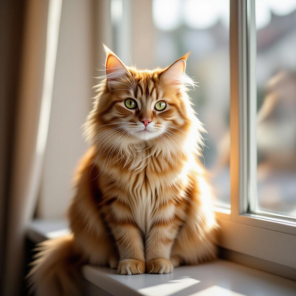 This image shows a fluffy ginger cat with green eyes sitting on a windowsill bathed in warm sunlight. Photorealistic detail captures fine fur, with a soft background blur.