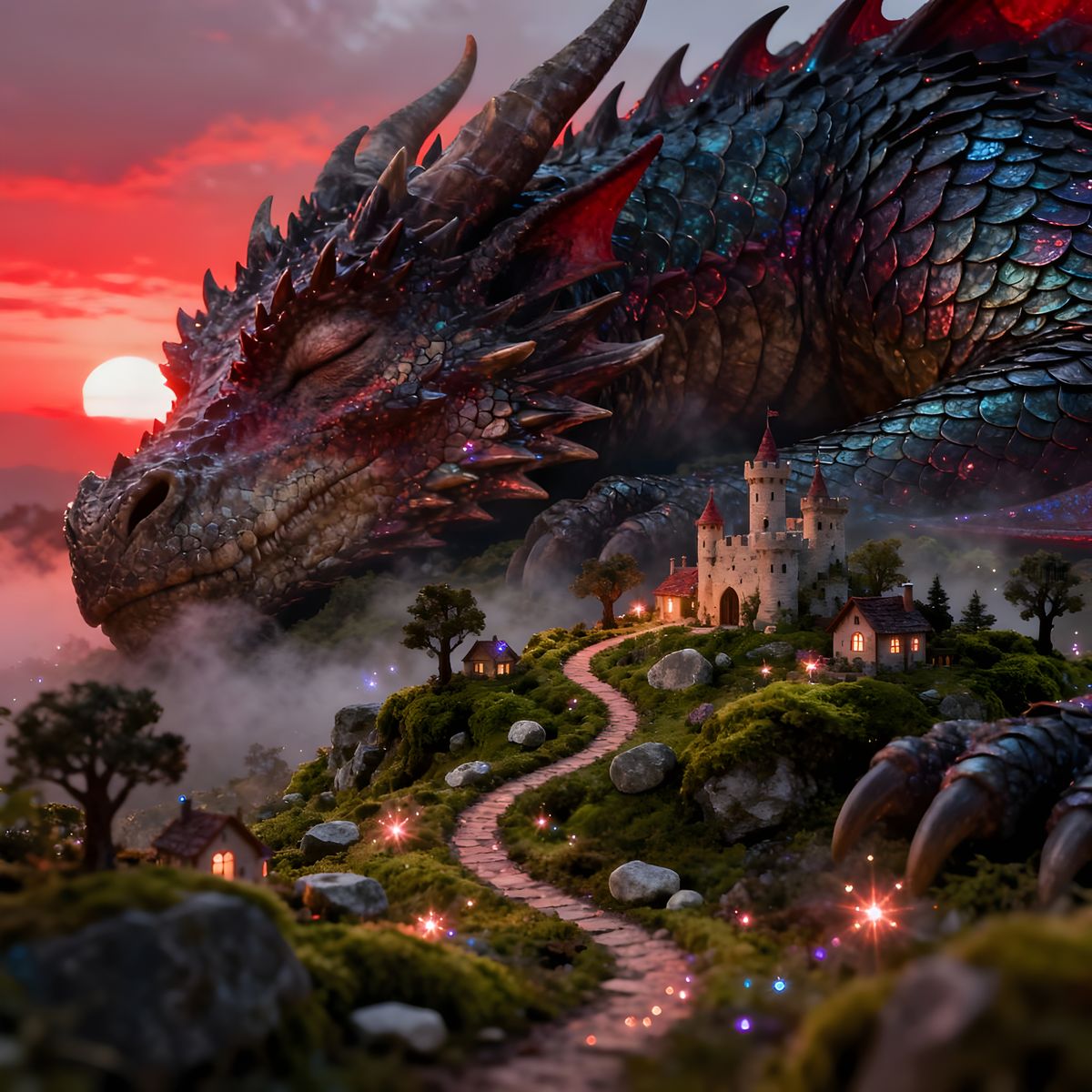 A surreal, hyper-detailed painting of a colossal sleeping dragon forming a landscape with tiny houses and a castle. Gentle mist glows in a warm sunset, rendered in fantasy realism with sharp focus and vibrant tones.