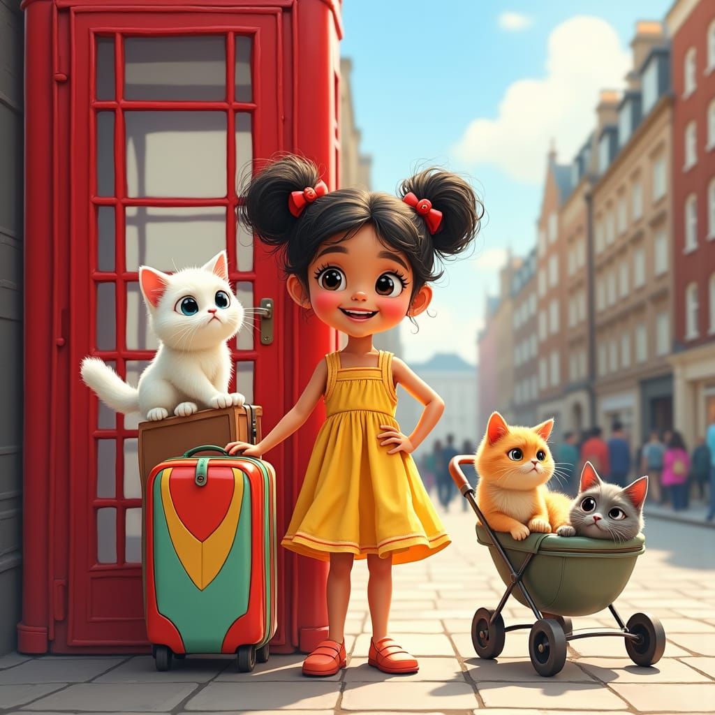 This image shows a South Asian girl on a London vacation with her four Persian cats. The digital illustration is reminiscent of Beatrix Potter's whimsical style, featuring intricate details and textures.