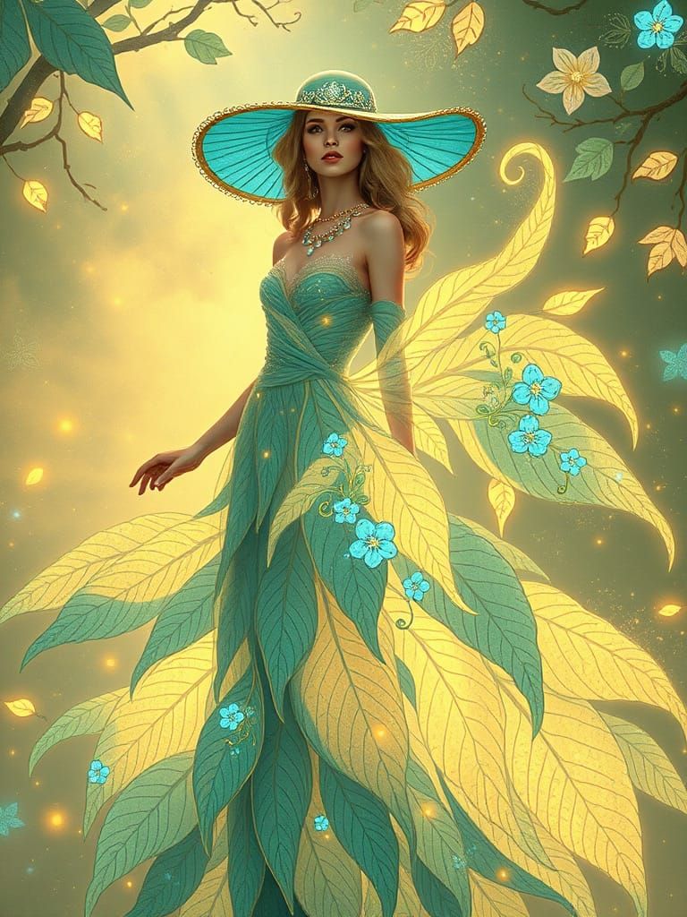 A stylized Art Nouveau portrait of a woman in a flowing leaf dress, featuring bioluminescent textures and azure floral details. The image has a dreamlike pastel glow and airy golden illumination.