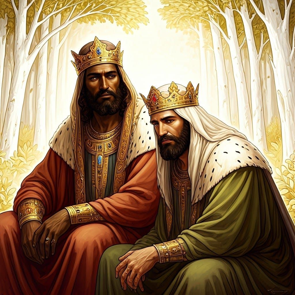 This serene painting depicts two monarchs, the king of Israel and the king of Judah, seated together in a tranquil setting surrounded by towering white cedars, golden light, and the sweet scent of tarshish, evoking a sense of peace and tranquility.