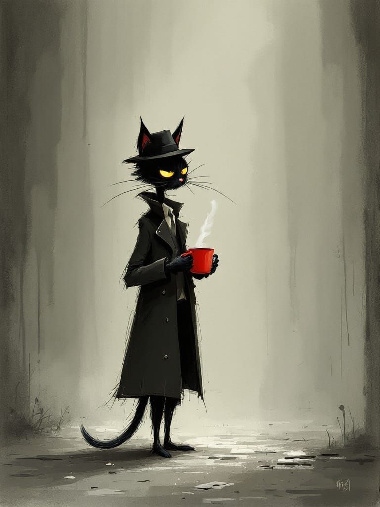 This illustration shows a lanky, anthropomorphic cat detective in a trench coat holding a steaming red mug. The art style blends expressive minimalism with textured brushwork for a whimsical noir mood.