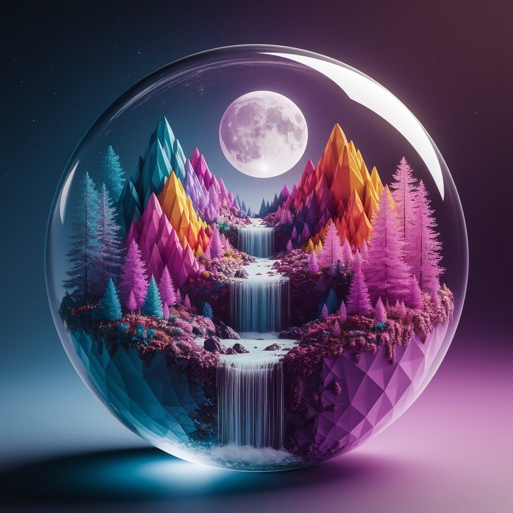 A striking picture of a glass orb containing a miniature world of mountains, waterfalls, and trees, bathed in dramatic moonlight. Rendered in a colorful, geometric style with hyperdetailed textures and dynamic lighting.