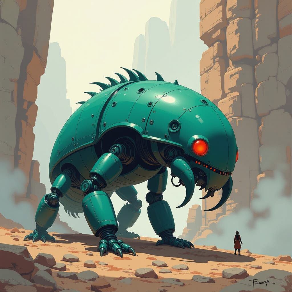 This cel-shaded illustration features bold colors and fine lines, evoking a powerful sci-fi aesthetic with influences from classic fantasy art.