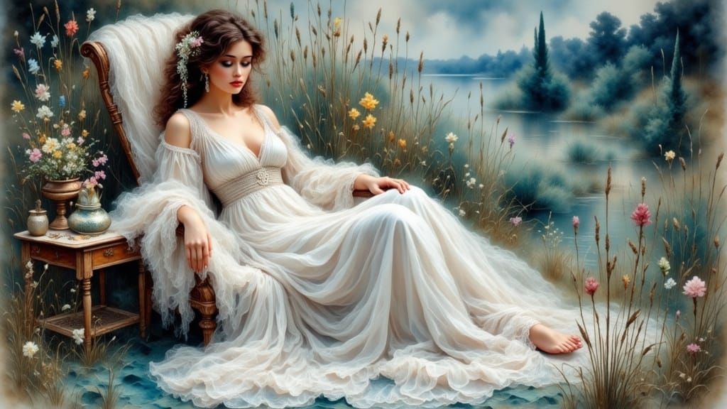 This image shows a Victorian woman relaxing in a hammock. She wears a delicate silk and lace dress, set against a misty backdrop with white and blue gradients, with abstract and surreal touches in a romantic style.