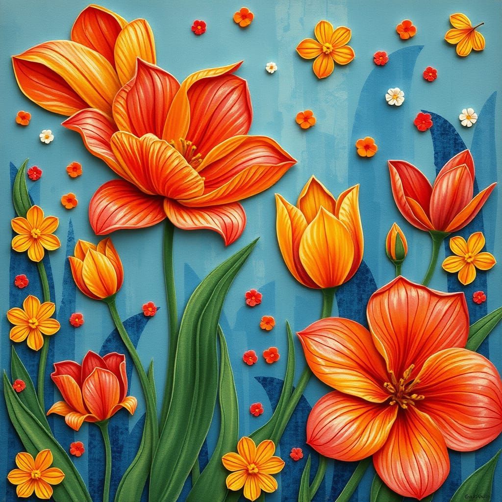 A vibrant bouquet of orange tulips with intricate petals and delicate leaves. The image is reminiscent of Henri Matisse's colorful cut-paper style, with soft, warm lighting.