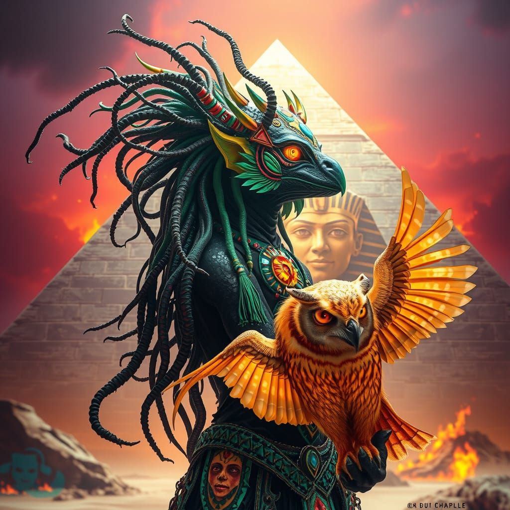 This image shows a mystical humanoid with iridescent dreadlocks, standing before a vibrant, graffiti-covered pyramid, amidst a kaleidoscope of colors, with a molten gold owl eagle frozen in mid-air, radiating fiery energy.