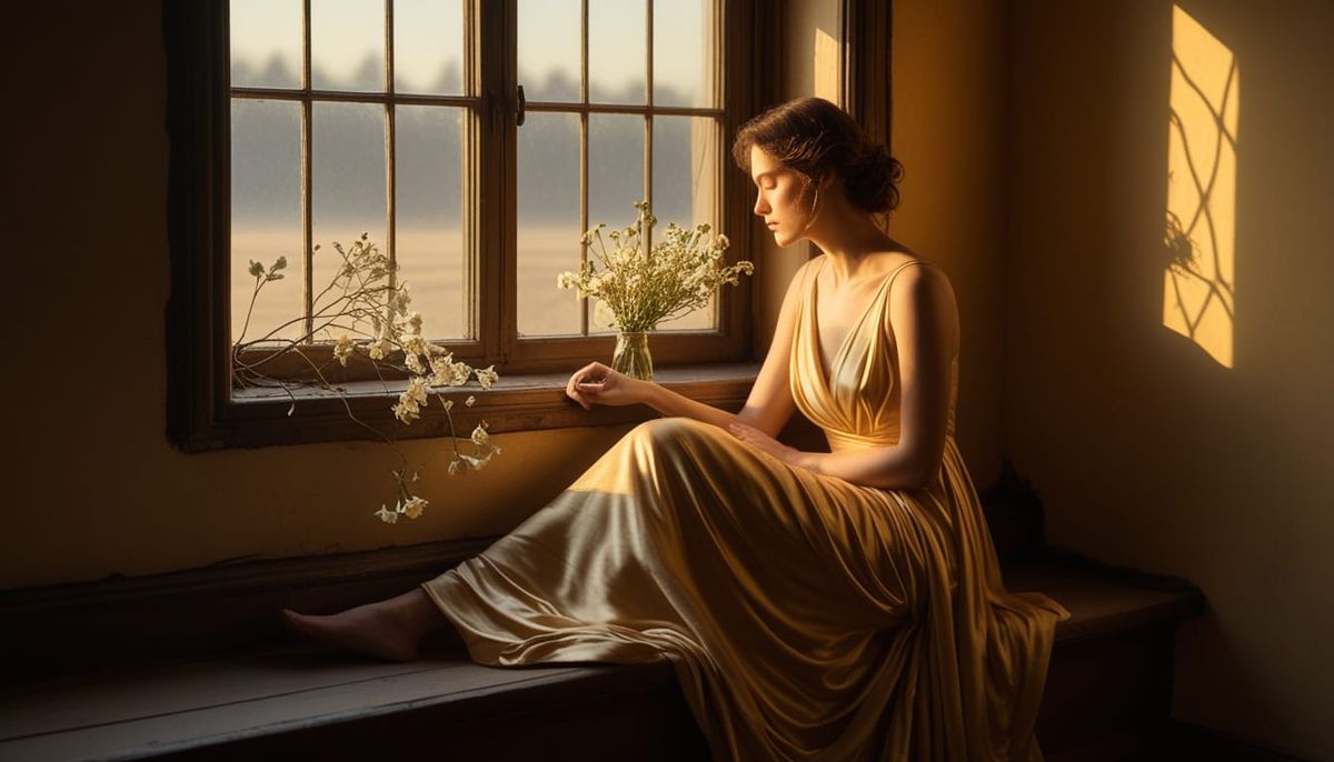 This image captures a moment of quiet contemplation, a woman seated by a window, lost in thought as morning light bathes her in a warm, golden glow.