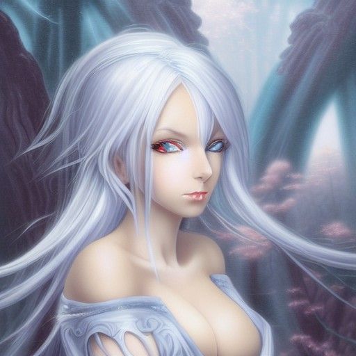 This image shows an anime-style succubus girl with white hair in a hyperdetailed ethereal fantasy environment. The artwork is reminiscent of Thomas Kinkade's style, with a misty, dreamlike quality.