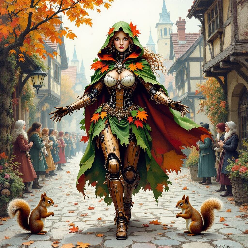 A striking picture of a female automaton with wooden skin and leaf cloak, charging down a kingdom street. Vine and moss accents add natural elements to the character, in an 80s fantasy art style.