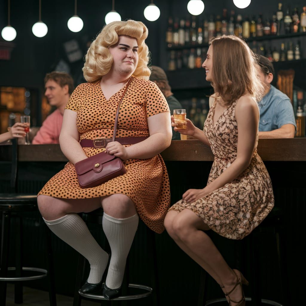 This professional photograph captures a young man dressed as a 1980s teenage girl, complete with a minidress, wig, and accessories, sitting in a lively bar with bokeh effects.