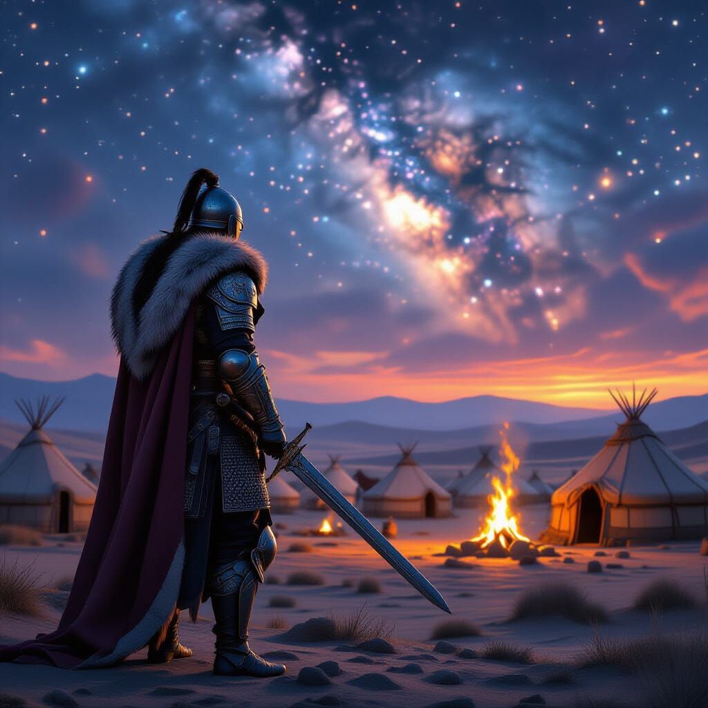 A lone Hun knight in detailed armour watches over a desert camp with yurts and bonfires under a swirling cosmic nebula sky. Evokes an epic, cinematic feel.