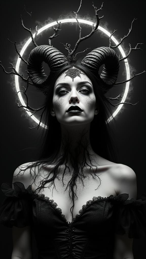 A dramatic dark fantasy portrait of a horned woman against a black void. She has cracked skin and ritualistic black markings, with a glowing occult halo behind her head. The image is greyscale.
