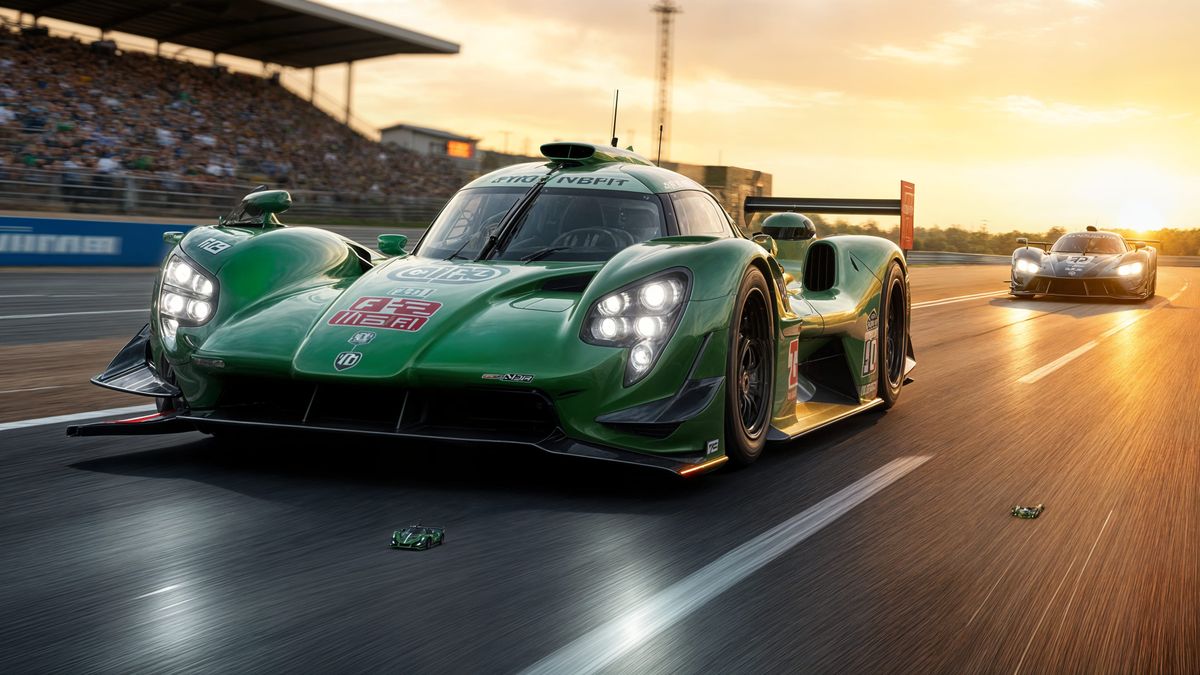 This image shows a green Le Mans hypercar speeding down a straightaway during a 24-hour race. The car's design and motion blur highlight its velocity as it approaches a challenging turn at dawn.