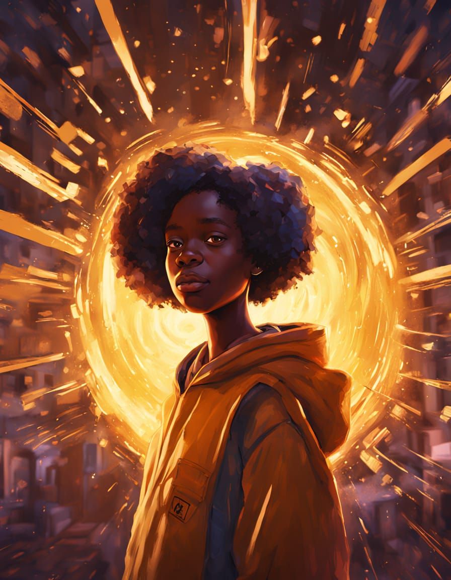 This image shows a joyful, rotund black girl with a warm smile turning off the lights in a festive, celebratory atmosphere, inspired by the vibrant colors and textures of Disney concept art
