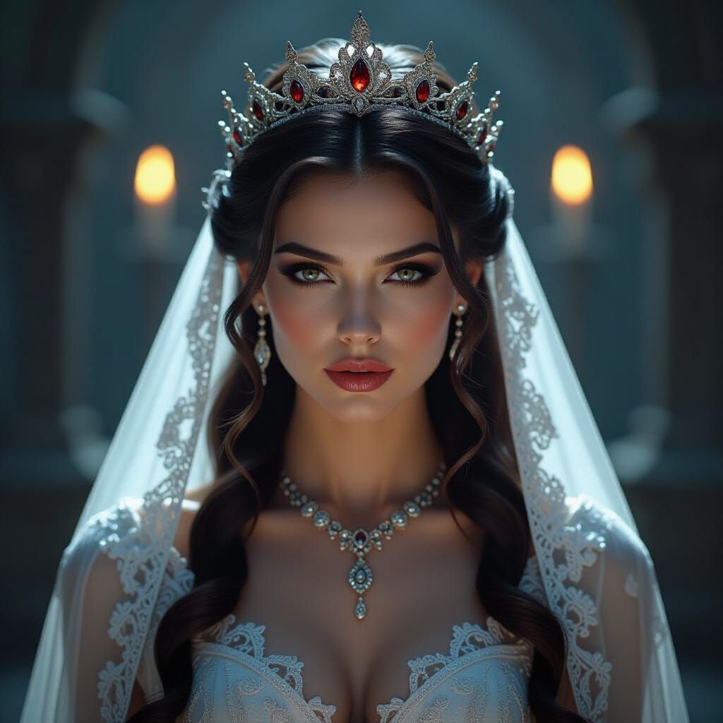 This cinematic portrait features a dark, regal goddess with a divine and unsettling gaze. Moody, high-contrast lighting and gothic undertones create a hyperrealistic and atmospheric image.
