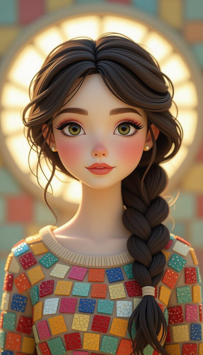 A close-up portrait of a girl with a felt textured face resting on her mother's lap. The artwork features dynamic lighting, a soft, warm glow, and a mosaic glass effect in a hyperdetailed digital painting.